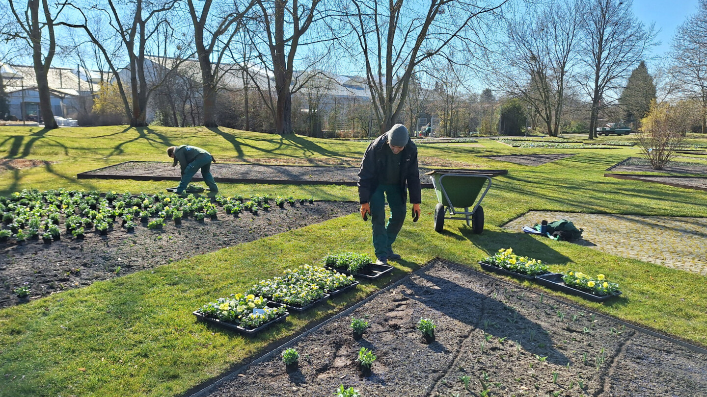 Im Britzer Garten, einem unserer anspruchsvollsten Pflegeobjekte, arbeiten wir über den fachtypischen Aufgabenbereich eines Landschaftsgärtners hinaus und setzen Wechselflorbepflanzungen ein. Ziel ist es, durch die Verwendung von Saisonpflanzen – wie in diesem Fall Garten-Stiefmütterchen – verlängerte Blütezeiten in den Grünflächen zu erreichen.